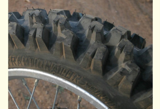MOTOZ tires are made from a different makeup of natural rubber than traditional knobbies and with a really tough carcass. Mounting is on the tougher side as the edge of the tire, like on most heavy-duty tires, needs to be forced into the center trough of the rim. They beaded up nicely and de nitely looked a bit different, especially some of the rears with the closed tread patterns with a bit of a trials tire look in some of the designs.