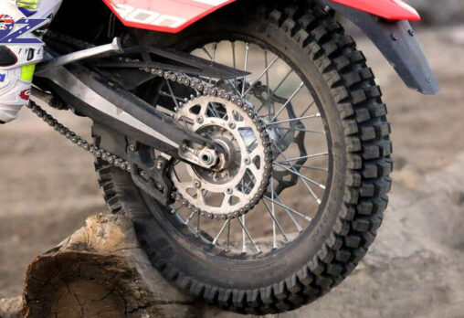 We tested the Mountain Hybrid on a bike that’s known to eat rear tyres for breakfast, the Husqvarna TE300, and we tested it with a clubman rider, an expert rider and in both wet and dry conditions over many months and what we learnt is that it’s tough to kill and finds traction in places and in amounts that borderline make no sense. At times on the trail, you see an obstacle and your brain accepts that the rear may step out or let go and pre-empts this with a counter-measure which may be a body movement or a response through the throttle. Now imagine seeing that obstacle and totally accepting that something’s going to let go and yet you hook up and drive, sometimes to the point where you have bring it back from a loop-out. That’s what riding with the Mountain Hybrid is like – it truly hooks up when you don’t expect a tyre should. The only time we felt with any consistency that the Hybrid didn’t feel completely solid was when you cornered right out on the edge. Our test riders were split in one area which was hard pack. One of our guys (the expert) thought the tyre had plenty of traction while out clubman tester thought a traditional knobby was a better choice. But interestingly, both agreed that it was amazing on hills even in the hard pack. Once we got into anything vaguely loamy or wet though, both riders agreed that the Hybrid was epic.
